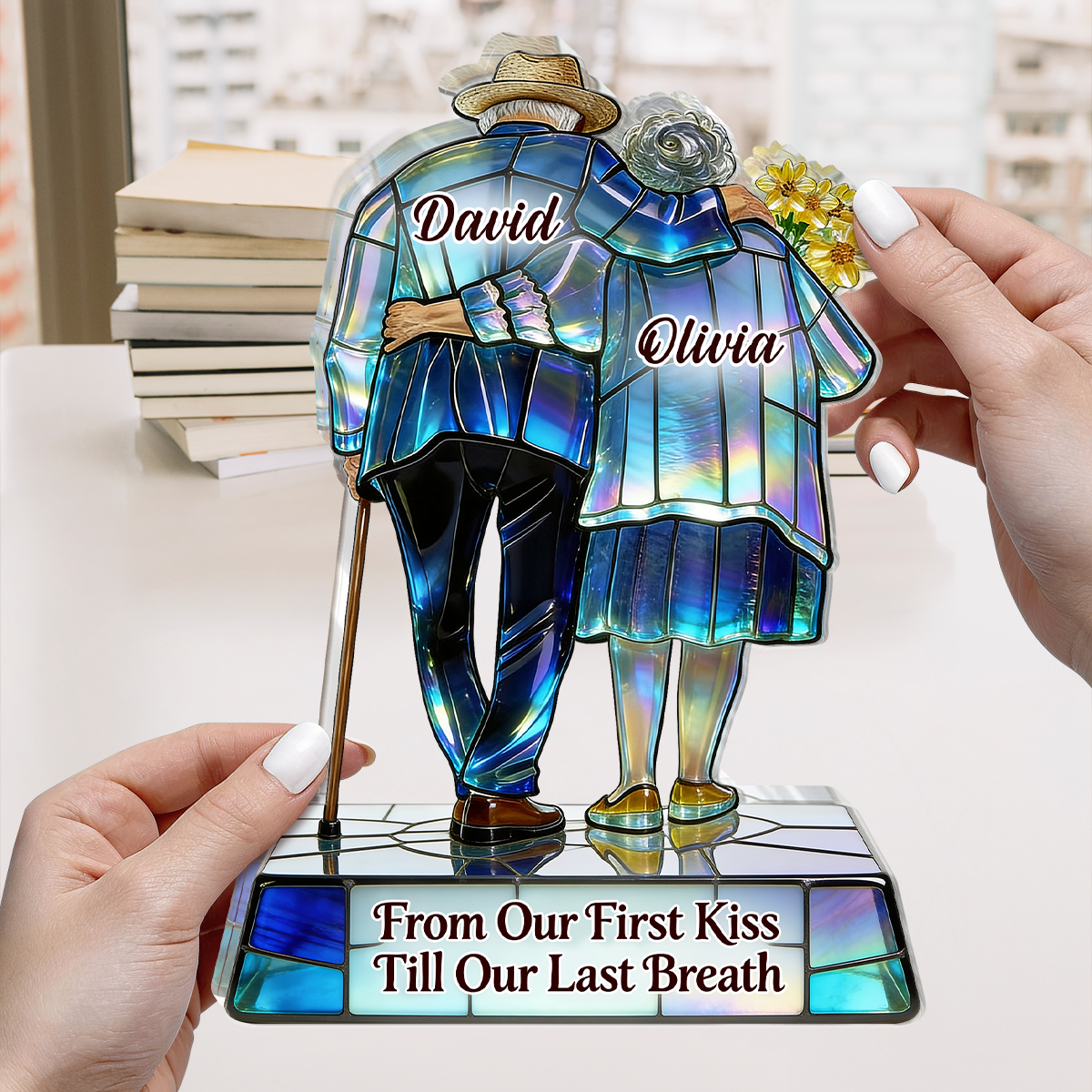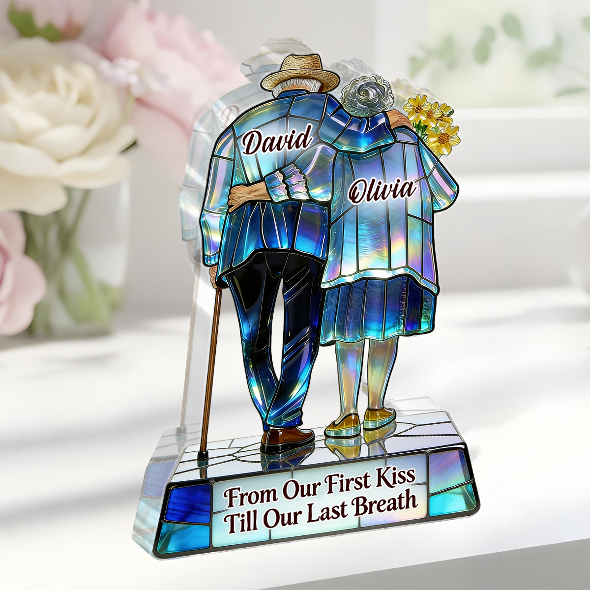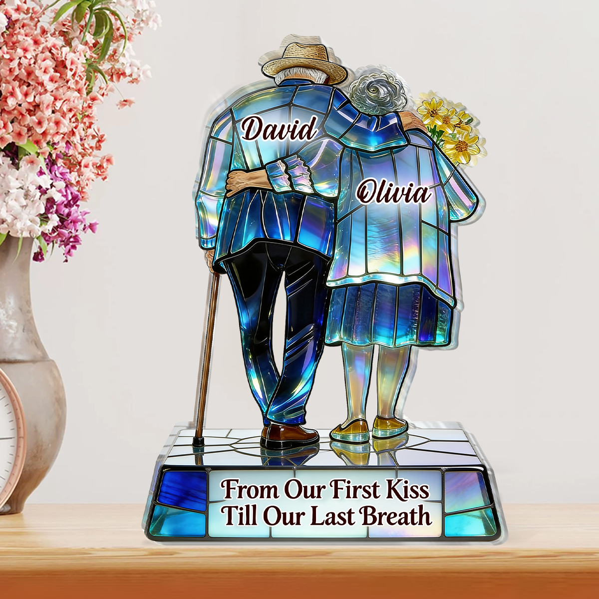 Design di coppia di anziani in vetro colorato: Una coppia di anziani si piega delicatamente in uno, avvolta all'interno di un'impostazione di vetro colorato iridescente e sognante. Abbinato a un girasole e un bastone da passeggio, questo design porta in vita la promessa per tutta la vita "dal primo bacio al respiro finale" come ricordo romantico e nostalgico.