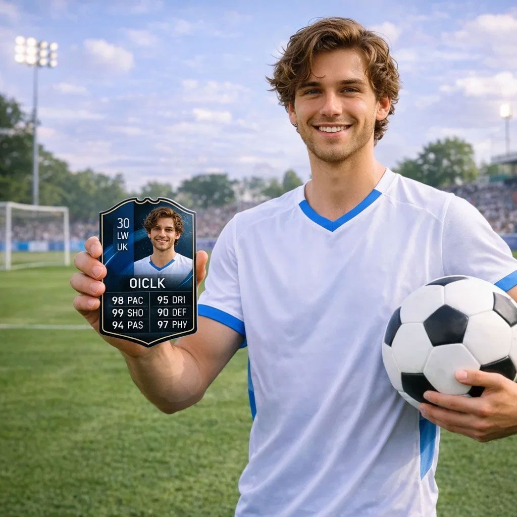 Design della carta del giocatore in stile FIFA: Ricodiando saldamente il layout classico di una scheda giocatore di gioco di calcio, rifinita con una trama sfumata blue-gold e una forma di scudo, questo design porta "passione di calcio e gloria personale" alla vita come ricordo alla moda-pieno di energia esports e stile atletico.