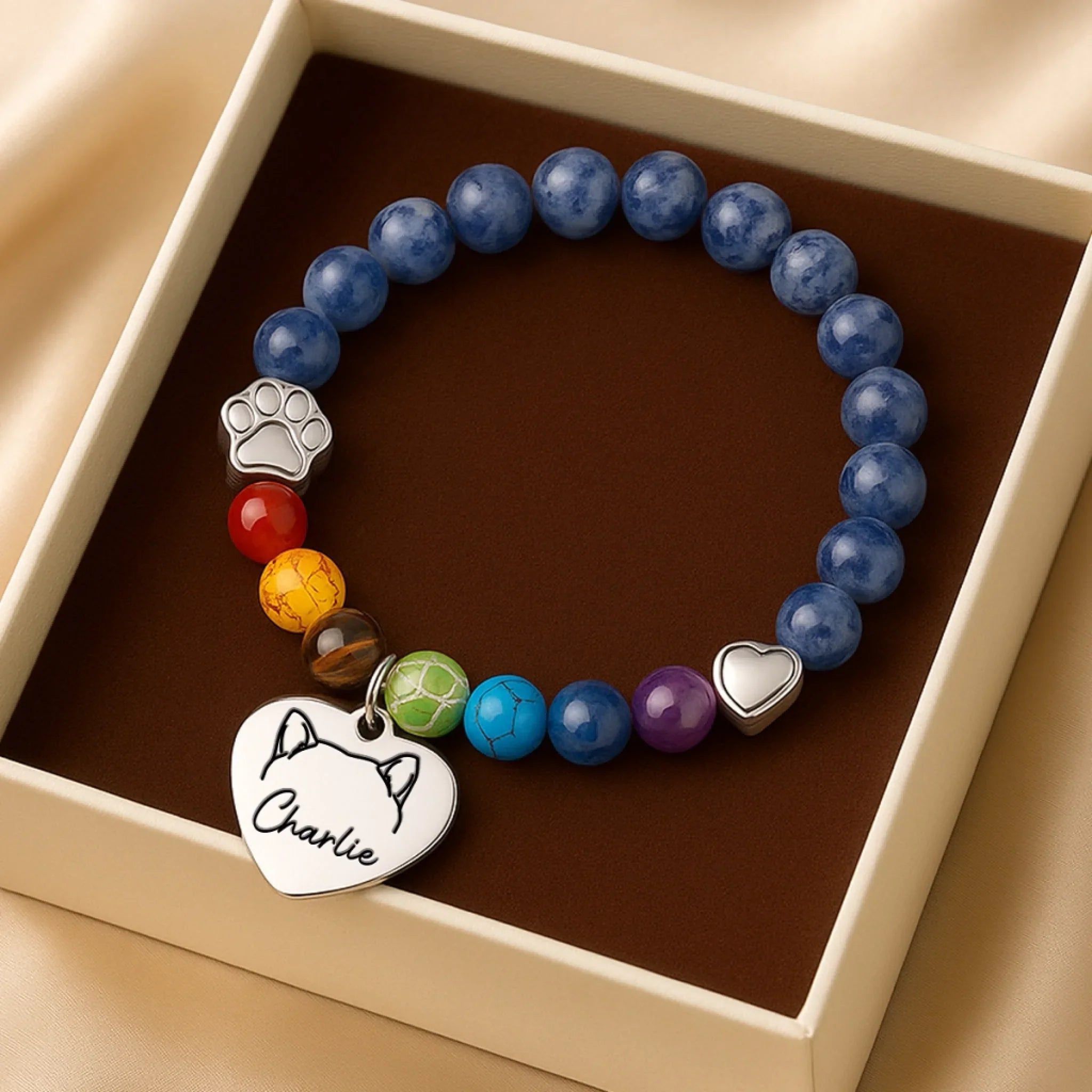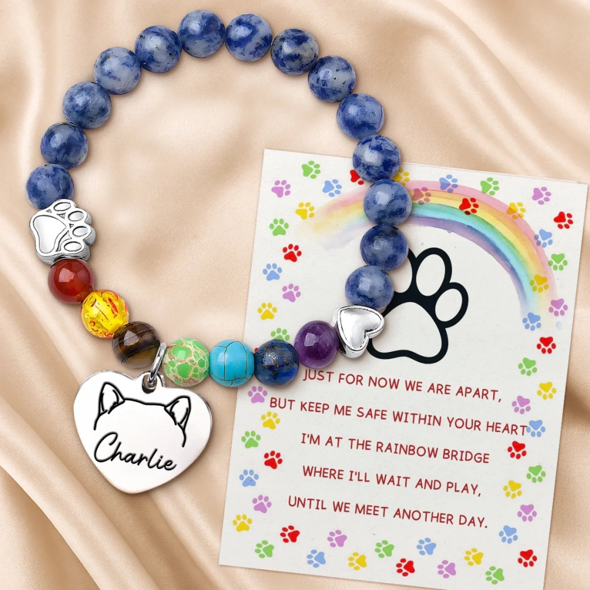 Denne minnesmykken fungerer som en øm påminnelse om kjærligheten delt med et kjæledyr, og gir trøst og håp i tapets stund. Den er smykket med livlige perler og gjennomtenkte sjarmeer, og utgjør et vakkert minne for din pelsede venn. Denne perlekjedet er en perfekt gave til enhver anledning: bursdager, høytider, jubileer, eksamen, Valentinsdag, morsdag, farsdag – eller bare fordi! Enten det er til venner, familie eller noen helt spesielle, vil denne allsidige gaven spre glede og skape varige minner.