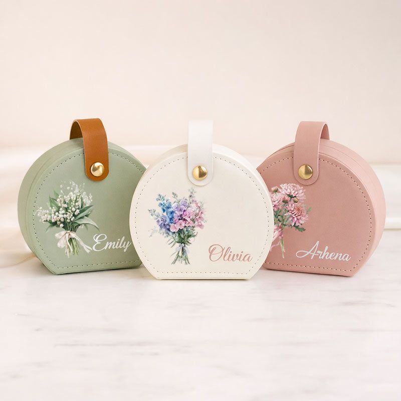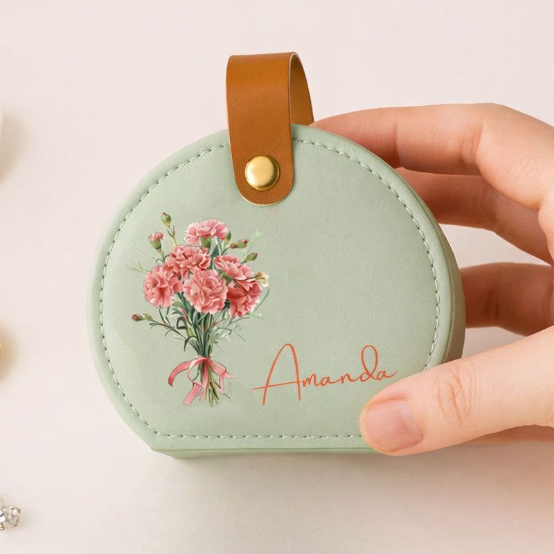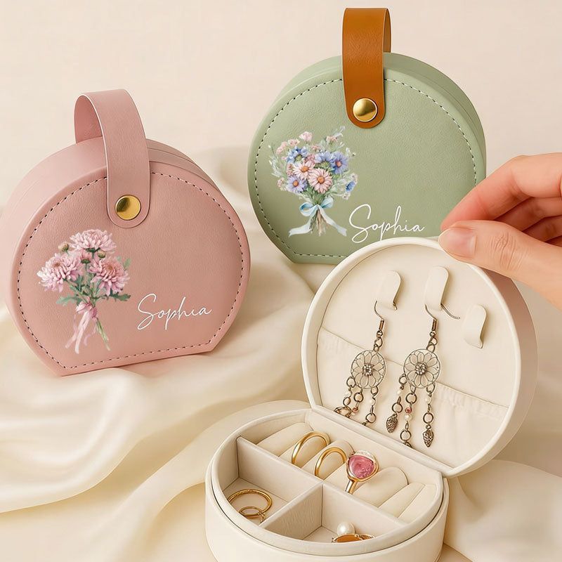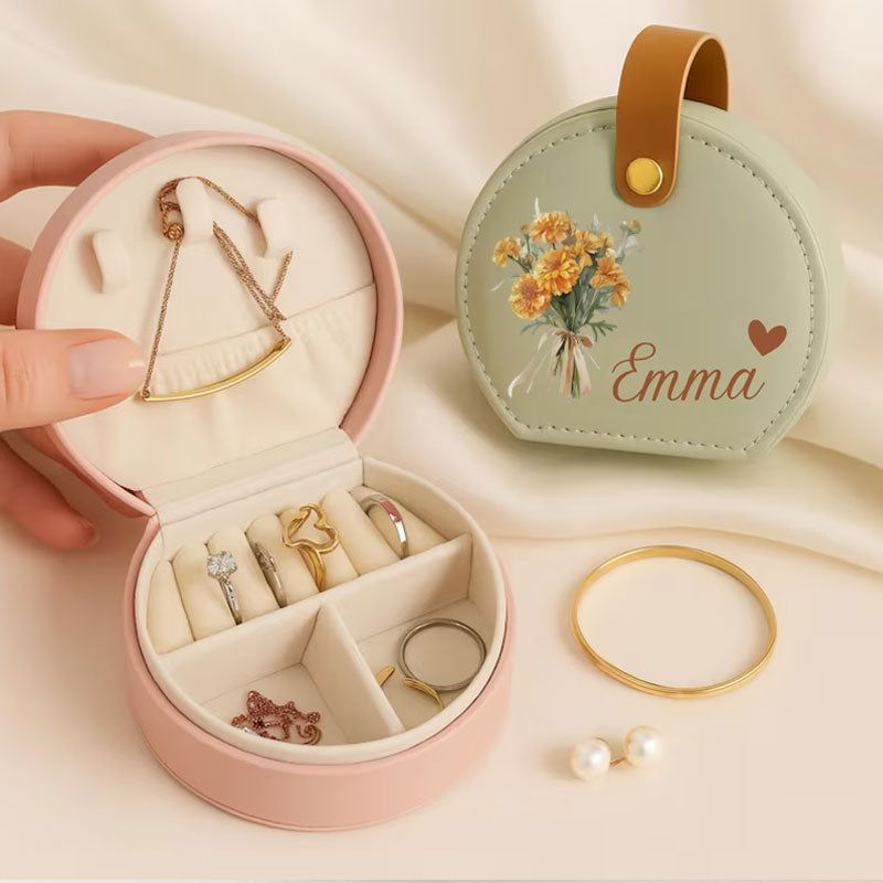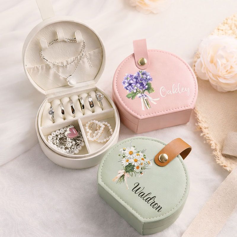 Portagioie da viaggio personalizzato-Custodia per gioielli rotondi con nome e fiore di nascita-Regalo per damigella d'onore, festa della mamma e regalo di compleanno per lei